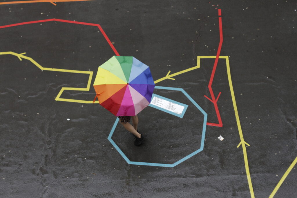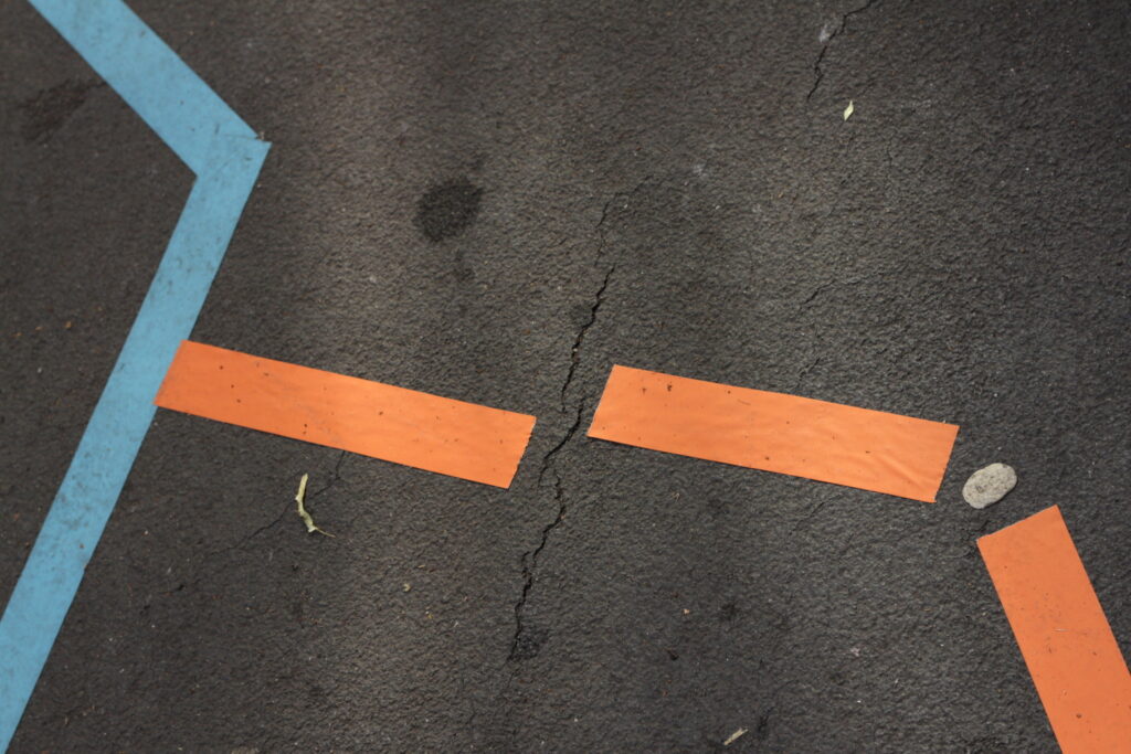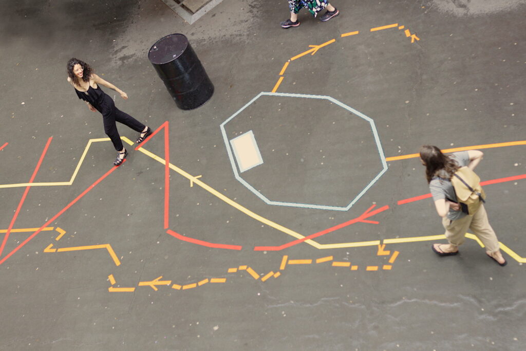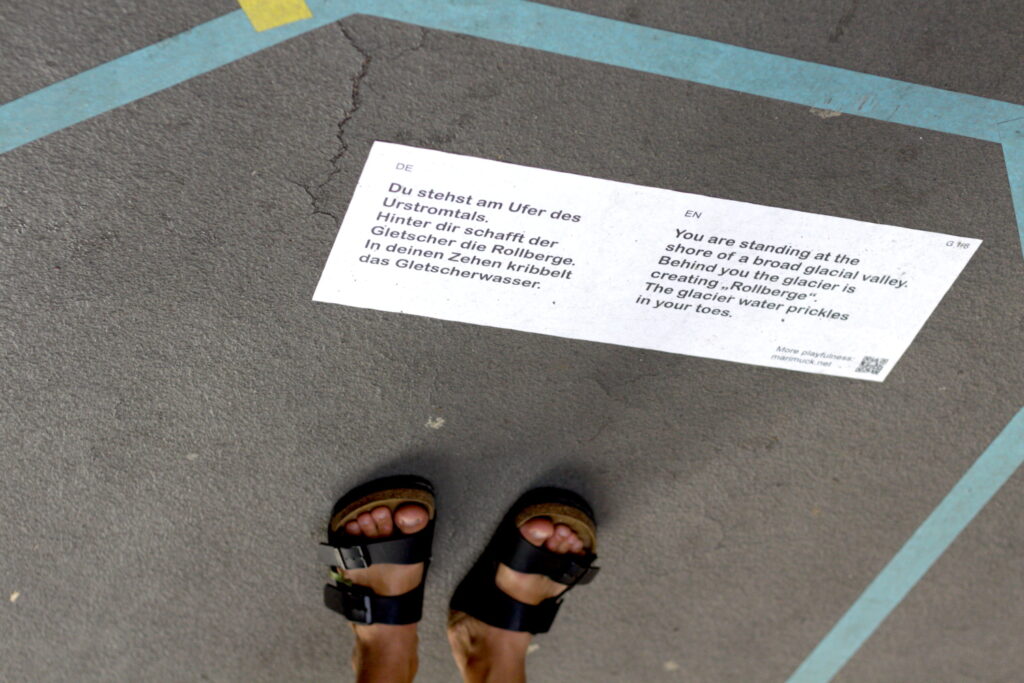 Tilspil ist eine spielerische Aktion im öffentlichen Raum. Ein Spielfeld klebt auf dem Boden. Die Spielenden folgen den Linien und spüren am eigenen Körper der Geologie vor Ort nach. Ruhig, verspielt und im wahrsten Sinne des Wortes tiefgründig. Die geologischen Hintergrundinformationen stammen aus dem frei zugänglichen Umweltatlas Berlin und beziehen sich auf genau diesen Ort.